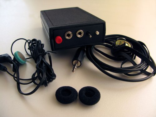 本体の装着 マイクとイヤホーンを差し込みます。 マイクは付属のゴムベルトで図のように喉に密着するように装着します。 電源スイッチを入れ、イヤホーンを耳から数センチ離した位置で赤いボタンを押し、音が出ることを確認してください。 次に声を出して声が出たとき、イヤホーンから音が出ることを確認します。もし音が出ない場合は感度調整ノブを回して声が出たとき、音が出るように調整します。これで調整は終わりです。イヤホーンを耳に装着してください。